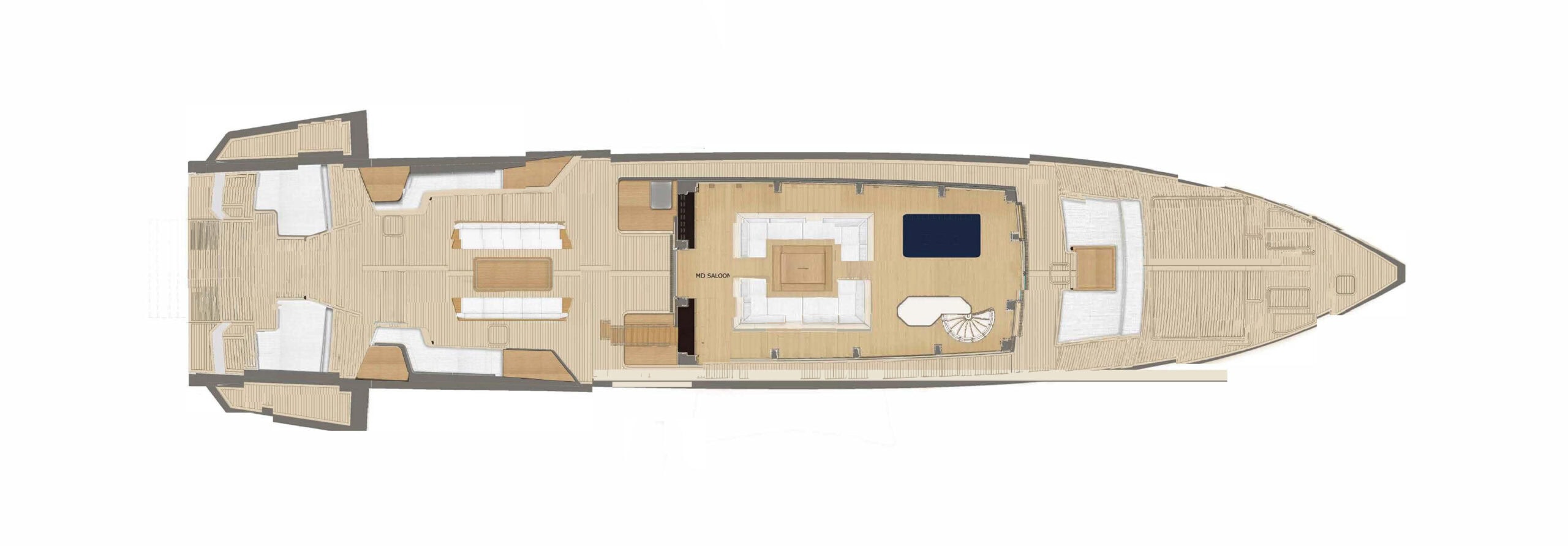 Stepping into SAN’s main saloon reveals a breathtaking interplay of light, space and sea. Surrounded by sole-to-ceiling glazing with minimal mullions, the space offers uninterrupted views and a tranquil sense of openness. Ingenious design decisions—like the recessed Japanese-style seating and strategic ceiling adjustments—allow for generous headroom without compromising the yacht’s sleek silhouette. It’s a masterclass in spatial harmony, where form and function are perfectly aligned.